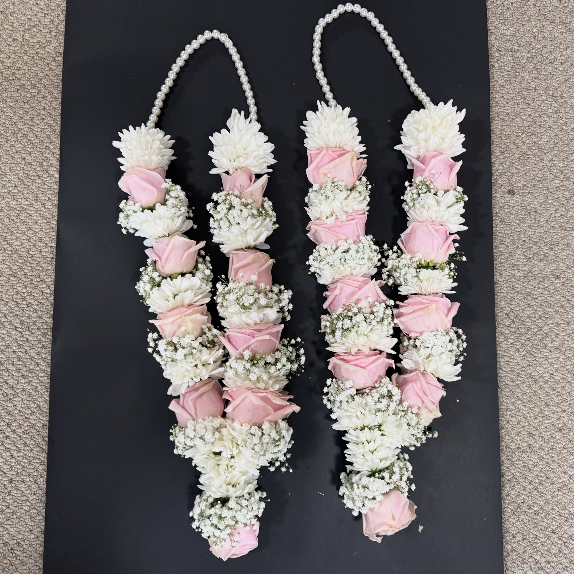 Premium pink roses paired with white chrysanthemums and delicate white gypsophila, handcrafted into an elegant wedding Jaimala. This lightweight floral varmala offers a soft, timeless look — perfect for Indian weddings, engagements, and traditional garland exchange ceremonies.